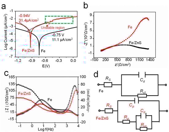 The degradation mechanism of Fe/ZnS and Fe was investigated by electrochemical tests. The obtained polarization curves were shown in Figure 4a. The corrosion potential (Ecorr) and corrosion current density (Icorr) were also calculated by Tafel extrapolation method, and the result was shown in Figure 4a. The Ecorr value of Fe and Fe/ZnS composite were −0.75 V and −0.94 V, respectively. And the Icorr value of Fe/ZnS composite was significantly enhanced to 31.4 ± 0.9 μA/cm2 as compared with that of Fe. The corrosion rate of Fe and Fe/ZnS calculated by the electrochemical parameters were ∼0.25 and 0.72 mm/year, respectively, as shown in Table 2. Particularly, for Fe/ZnS composite, there was a typical pitting area in the region of anode polarization curve, as marked in Figure 4a. It was suggested that the addition of ZnS was effectively pierced through the dense corrosion layer, and changed the corrosion type from surface corrosion to pitting corrosion. The electrochemical impedance spectra are shown in Figure 4b. The Fe/ZnS composite showed small impedance value than that of Fe, which also verified its low corrosion resistance. For the Fe part, there was only one impedance loop in the whole frequency range, indicating the formation of compact oxide film during corrosion. However, Fe/ZnS composite had a relatively small capacitive arc and impedance moduli at low frequency region, reflecting a low electron transfer resistance. Furthermore, the phase angle value and impedance value in the Bode plots were further applied to indicate the stability of corrosion films, presented in Figure 4c. For Fe/ZnS composite, the phase angle value and impedance value were smaller, which indicated the corrosion film was a loose membrane structure. It was believed that the passive film was continuously self-destroyed, thus reducing the protection efficiency for Fe/ZnS composite. The equivalent circuits of electrochemical tests for Fe and Fe/ZnS were obtained, shown in Figure 4d. There was only a semicircle in the EIS diagram, which meant only exist a corrosion layer on the Fe matrix. There were two semicircles for the Fe/ZnS composite, which indicated another transfer reaction except. Generally, it was remarked by a double-layer capacitance Cd and charge transfer resistance Rct. Rct, and Cd were the resistance and capacitance of the passive film, respectively. As for the Fe/ZnS composite, a relatively low Rct and Cd revealed its high charge transfer ability of the product layer.