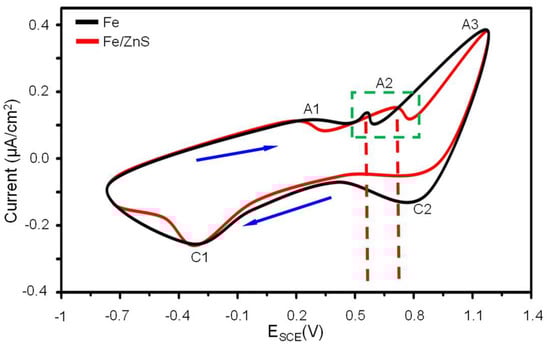 The cyclic voltammetry (CV) curves of Fe and Fe/ZnS samples were presented in Figure 5. The A curve was the anodic branch while C curve was the cathodic branch. Three anodic current peaks of A1, A2, and A3 were observed during the anodic scan process. The A1 peak was considered to correspond to the electro-oxidation of Fe to Fe2+, which was represented the initiation of passivity formation. There was no significant difference between Fe and Fe/ZnS samples at the A1 peak. The A2 peak was characterized with the oxidation process from Fe2+ to Fe3+, which was represented the formation process of a denser Fe2O3 passivation film. The A3 peak involved the transfer reaction and oxygen evolution reaction on behalf of the dissolution of Fe anode. At the A2 peak, the potential of Fe was around 0.6 V, but for Fe/ZnS samples the potential shifted to 0.7 V and caused a faster anodic reaction. With the positive shift of the potential, the anodic reaction was activated, the corrosion current increased gradually. Generally, the potential was more positive (which meant a higher anode activation energy), and thus the oxidation reaction was easier to carry out. Therefore, it was indicated that S destroyed the formation of the passivation layer and caused the continuous exposure of Fe matrix to corrosion solution, thus accelerating degradation.