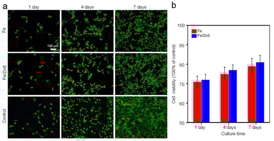 Generally, bone implants not only require a porous structure and appropriate degradation rate but also need good biocompatibility [,]. Both Fe and Zn were the trace elements of human body, and possessed good biocompatibility. As our cell testing proved, the cell viabilities of Fe/ZnS of Fe extracts were higher than 80% at day seven, which was acceptable as bone implant. It was worth noting that Fe/ZnS had a higher degradation rate, that was, a higher ion concentration for Fe/ZnS group. However, the cellular activity for Fe/ZnS group was still higher than that of the Fe group. This may be due to the fact that the released Zn ions exerted a positive role. Zn plays a significant role in the formation, development, mineralization, and maintenance of healthy bones [,]. Thus, it was expected that Zn ions released from the Fe/ZnS composites could promote cell growth and proliferation.