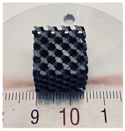Bone implants should have a through-hole structure similar to natural bone, so as to provide a necessary microenvironment for cell growth, angiogenesis, and new bone growth after implantation [,]. It is generally believed that the pore size suitable for bone tissue growth ranges from 200 to 600 μm. At the same time, the porosity should reach more than 70%, which is conducive to cell adhesion, extracellular matrix deposition, oxygen, nutrition entry, and metabolite discharge [,]. In addition, bone implants should also have personalized and accurate shapes to improve the adaptability of implants in the process of operation and the effect of postoperative treatment [,].