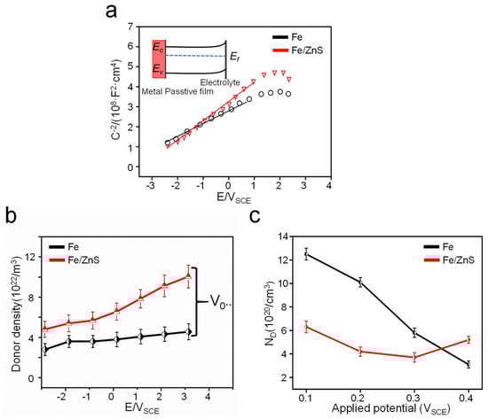 On the other hand, bone implants also demand suitable degradation rate to match the growth rate of new bone tissue []. In the present study, ZnS was introduced into the Fe matrix to accelerate degradation. Both the immersion tests and electrochemical tests proved that the Fe/ZnS showed an enhanced degradation rate, since the ZnS promoted the collapse of the passive film. In fact, the collapse of the passive film was closely related with its electronic properties. Herein, the typical Mott-Schottky plots were used to characterize the electronic property of the passive film, as shown in Figure 8a. The positive slopes of the two curves indicated that the passive film exhibited n-type semiconductor behavior. It was attributed to the present of minority carriers in the corrosion layer, and its defects were composed of oxygen vacancies. The variation range of passive film defect density with polarization potential has been shown in Figure 8b. It was obvious that the donor density in the corrosion layer increased with the increase of polarization voltage, thus resulting in the increase of vacancy accumulation between the Fe matrix and passive film interface. Therefore, the corrosion pits were formed in the Fe matrix, as verified by the corrosion surface and electrochemistry experiments. The calculated oxygen vacancy density of the passive film also demonstrated these results, as shown in Figure 8c. The electronic conductivity of the general corrosion product film was related with the defect concentration, according to other research result. The defect concentration for Fe/ZnS composite could enhance the electron transmission of the passive film, thereby resulting in the formation of corrosion pits on the surface. In this condition, the protective effect of the passive film was gradually weakened, which further accelerated the damage of passive film and the corrosion of the Fe matrix.