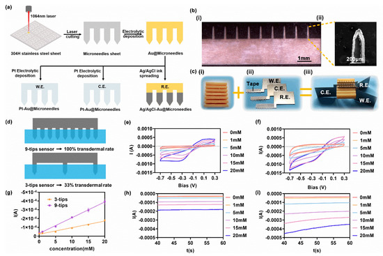 Three electrode microneedle sheets were prepared by laser cutting of stainless-steel sheets, and treated by the subsequent processes including cleaning and electrodeposition of Au and Pt (Figure 1a). Such Pt-Au-Microneedle construction was proved to be stable, on account of the mature electrodeposition technology and the commercial electroplating solution [38].