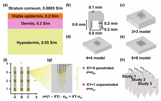 where σde is the dermis conductivity and σsc is the stratum corneum conductivity. When XY is 1, its surface conductivity is equal to that of the stratum corneum, indicating an unpenetrated microneedle. When XY is 0, its surface conductivity is equal to that of the dermis, indicating a penetrated microneedle (Figure 3g). Thus, the microneedle state (penetrated/unpenetrated) was controlled by a pair of parameters (0 and 1), avoiding to rebuild the geometry of each transdermal condition.