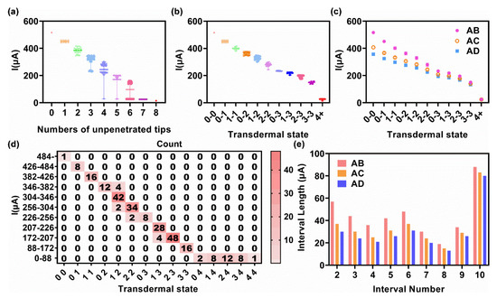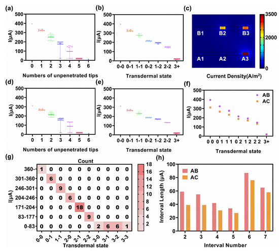 Figure 4d,e demonstrates the current test results between sheet A and sheet C. The nest distribution of IAC was almost identical to IAB, except that the overall current range was narrower. As the distance between sheet A and C was 1600 μm and that of sheet A and B was 800 μm, the increased distance led to the weakened current response. The mean values of each transdermal state of the 3 × 3 microneedle array model were shown in Figure 4f, and the current was divided into intervals according to these mean values, for subsequently estimating the number of unpenetrated tips by test current. The boundary of each interval was the mean value of the mean value of the adjacent state. The details of the division of the 3 × 3 microneedle array model are provided in Table 1.