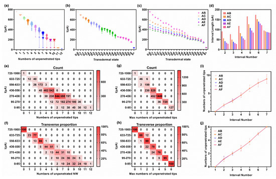 Simulation results of the 6 × 6 microneedle array model, obtained from the statistical analysis of the terminal current after sweeping 4096 transdermal events per pair of microneedle sheets. (a) The nested figure of the current distribution of A-B inter-sheet, divided by Ntotal. (b) The nested figure of the current distribution of A–B inter-sheet, divided by the transdermal state. (c) The statistical results of the test current against the transdermal state. (d) Histogram of the interval length of each interval. The x–axis started at interval 2 on account of that the interval 1 was half open. (e) The counting heat map of the current interval against the Ntotal of A–B inter–sheet. (f) The percentage heat map of the current interval against the Ntotal of A–B inter-sheet. The numerals in each cell referred to the probability of Ntotal in certain current intervals. (g) The counting heat map of the current interval against the Nmax–s in a single sheet of A-B inter-sheet. (h) The percentage heat map of the current interval against the Nmax–s of A-B inter–sheet. The numerals in each cell referred to the probability of Nmax–s in certain current intervals. (i) The statistical results of the Ntotal of each interval in the A–B inter–sheet. (j) The statistical results of Nmax–s in a single sheet of each interval in the A–B inter–sheet.
