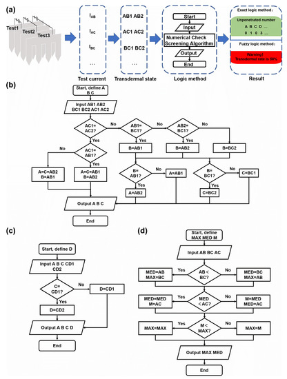 The logical principle for transdermal rate evaluation via the test current. (a) The workflow of the designed logic judgment system. (b) The logic diagram of the exact logic method for the three sheets area. A, B, and C were the unknown variates referring to the Nexact of the microneedle sheet A, B, and C. AB1 and AB2 were the input referring to the transdermal state against IAB. Similar definition to BC1, BC2, AC1, and AC2. (c) The logic diagram of the exact logic method for the adding sheet. This work branch was based on the result of Figure 7b. D is the unknow variate referring to the Nexact of the microneedle sheet D. CD1 and CD2 were the input referring to the transdermal state against ICD. (d) The logic diagram of the fuzzy logic method for the three sheets area. MAX and MED are the unknow variates referring to NMAX and NMED, and Variate M is the temporary storage. AB, CD, and EF are the input referring to the Nmax-s for the corresponding sheet pairs.