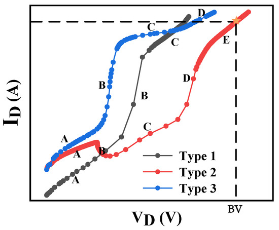In particular, as shown in Figure 2, the simulated off-state I–V curve indicates that the analysis of the off-state characteristics on the device is quite complicated. The three plots in Figure 2 are exported from the commercial TCAD tool Sentaurus. The breakdown can occur under various states, such as partially depleted breakdown and fully depleted breakdown. When the breakdown occurs, the depletion region may be at different depletion stages, and the current trend will also occur differently. In particular, the condition can be ascribed to three different types according to the changing trend of leakage current with drain voltage [12,13]. Especially for the case of type 2, as shown in Figure 2, there are five different stages in the trend of leakage current, which also demonstrate the superior difficulty of the off-state characteristics analysis. Yet, the prediction of the off-state performance is essential to a power device such as an AlGaN/GaN HEMT. Hence, we propose the ANN-based method to characterize off-state characteristics. The proposed approach is expected to provide an efficient and accurate prediction tool by using the data to explore the latent relationship between the device and its off-state performance without physical requirements.