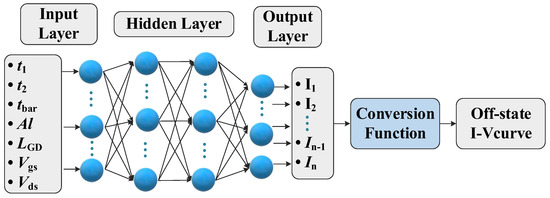 For the ANN architecture used in this paper, the input neurons represent the applied voltage (i.e., Vgs, Vds) and structure parameter (i.e., t1, t2, tbar et al.). Figure 3 shows the overall flow of the proposed framework for off-state performance characterization. The number of hidden layers and the neurons are the training hyperparameters (i.e., weight, bias), which are subject to the tuning process to realize the optimal solution according to the complexity of the prediction task. The neurons of the output layer represent the current-related features, which are used as the input of the conversion function. As for the configurations for the proposed ANN, first, ReLU is employed as the nonlinear activation function [14]. Then, Adam optimizer is used to perform the error backpropagation process by updating the training parameters [15]. In addition, an adaptive learning rate is utilized to control the optimization process [16]. Moreover, the error between the output layer and the targets can be evaluated as the mean square error (MSE) [17], which can be formulated as:
