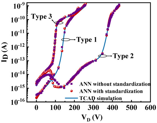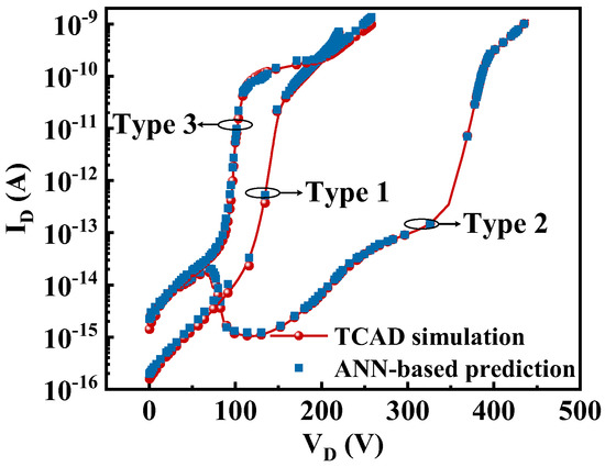 Figure 4 shows the comparison between the predicted results from the ANN-based framework and targets simulated by TCAD simulation. As shown in Figure 4, clearly, with the increase in the drain voltage, the different structures will go through different states to achieve breakdown. The three different types of off-state I–V curves corresponding to Figure 2 are given. The red round point line represents the off-state performance obtained by TCAD simulation, and the blue square point results, representing the predictions of the proposed ANN-based method, are almost in good agreement with the target simulation results, demonstrating the capability of the proposed approach. Moreover, all of these I–V curves can be effectively characterized by the ANN-based framework without physics domain knowledge.