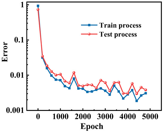 Figure 5 shows the off-state I–V curve prediction error changes under different training epochs. In the initial stage of the training process, the prediction error is relatively large, so the error drastically changes to optimize the loss function by updating the training weights and bias. As the training epoch increases, the error changes tend to converge, validating the effectiveness of the model optimization process. In addition, since the ANN-based model optimization is a dynamic tuning process by updating the training parameters, it is reasonable to have small fluctuations accompanying the training process. Meanwhile, the similar changes in training and testing errors indicate that no overfitting occurs during the model generalization process.