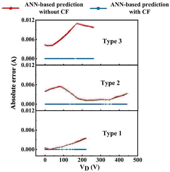To examine the effectiveness of introducing the conversion function, we explore the prediction results without considering the conversion function (CF). Figure 6 gives the results by only using the ANN framework with and without the conversion function. The results represent the absolute error between the ANN-based predictions and TCAD simulation. The closer to zero, the better the results. As the figure shows, the absolute error between the predictions and targets of the prediction framework with CF under the three types of condition are close to zero. However, those results without CF fail to capture the relationship between the input features (i.e., Vds, t1, t2, tbar, etc.) and the drain current. Since the drain current covers a wide range of dimensional units, such a case will severely affect the convergence behavior of the ANN framework, thereby leading to training failure. However, by utilizing the conversion function to exponentially process the output results, the magnitude range of the data can be narrowed to a small range, making the network training more accurate and efficient.