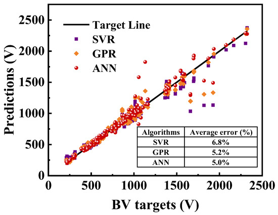 Figure 8 shows the breakdown voltage prediction results from the off-state I–V curve. The points represent the results obtained by the various machine learning algorithms, including support vector regression (SVR), Gaussian process regression (GPR), and the proposed ANN-based method. The solid black line represents the results where the targets are equal to the predictions. The closer the points are to the line, the higher the prediction accuracy of the results is. It is important to note that almost all predicted points representing breakdown voltage are located on the target line with these machine learning approaches. Yet, by means of the numerical calculation, the use of the proposed ANN method allows an average prediction error of around 5%, which shows superior capability for the prediction task.