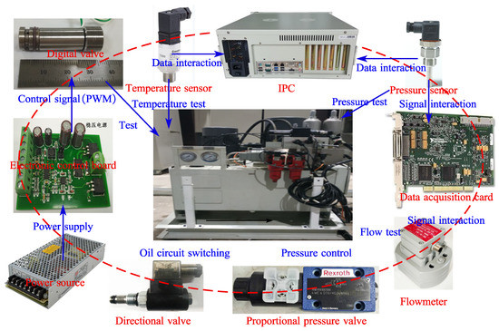 The control system scheme of the test bench is shown in Figure 6. The whole control system takes into account safety, reliability, economy and scalability. The operation status of the main components of the system can be reflected in the control system. The signals of sensors (temperature sensor, pressure sensor, control board current and flow sensor) are collected through the data acquisition card. At the same time, the analog signal is sent to the proportional relief valve to control the pressure of the valve, the PWM signal is sent to the control board to change the control signal of the digital valve, and the switching value signal is sent to the electromagnetic directional valve to switch the oil circuit. The system has an oil temperature alarm, system pressure alarm, oil filter pollution alarm, and other alarm functions. When the system fails or needs emergency shutdown, it can be cut off through the emergency stop button on the electric control cabinet to ensure the safety of the system and avoid damage to the system.
