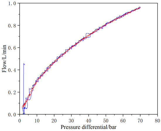 The pressure differential-flow characteristics of the micro high-speed digital valve are tested in the study. The inlet pressure of the valve is kept stable through the closed-loop control of the proportional relief valve in front of the valve, and the outlet pressure changes with the closed-loop control of the proportional relief valve behind the valve. Control the inlet pressure in front of the valve at 210 bar and the outlet pressure behind the valve at 140~210 bar, so that the pressure differential at both ends of the valve changes between 0~70 bar (according to the test standard, set the total pressure of the valve to be reduced to one-third of the maximum oil supply pressure). Set the control frequency of the valve to 100 Hz, the duty cycle to 100%, the outlet pressure behind the valve increases from 140 bar to 210 bar, and then decreases from 210 bar to 140 bar. Test it by reciprocating twice. The characteristic curve is shown in Figure 7. From the test results, the pressure differential-flow characteristics is stable and has good repeatability.