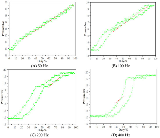 When testing the control signal-pressure characteristics, control the inlet pressure of the valve at 15 MPa, set the carrier frequency at 50 Hz, 100 Hz, 200 Hz and 400 Hz, respectively, and test the pressure characteristics of the valve by changing the duty cycle. The characteristic curve is shown in Figure 8. At low frequency (50 Hz), the hysteresis of pressure characteristics curve is small (4.9%), and with the increase of carrier frequency (400 Hz), the hysteresis of pressure characteristic curve increases (18.6%). This is because under the low-frequency test conditions, the electromagnetic performance of the valve core can be better restored with the increase or decrease of the signal, while under the high-frequency test conditions, the electromagnetic performance of the valve core cannot be completely restored with the change of the signal, resulting in the change of the electromagnetic force and finally the large hysteresis of the pressure characteristics. In addition, at low frequency, the linearity of pressure characteristics is better than that at high frequency. This is due to the different duty cycle, and the linear relationship between the position of valve core and duty cycle is large.