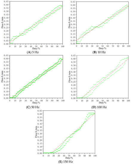 Visually, when the duty cycle is small, there is a dead zone in the flow, which is due to the short time of high level, the current does not reach a certain value, and the valve core fails to overcome the motion resistance and is in a static state. When the duty cycle is large, there is a saturation zone in the flow, because the high-level time is long, the current remains at a large value, the recovery force of the valve core is less than the electromagnetic suction, and the valve core is open. The signal-flow characteristic curve is shown in Figure 9. To display the signal-flow characteristics at different frequencies, the characteristic curves at five frequencies are divided into five diagrams. In the test, the pressure differential of the valve is controlled at 3.5 MPa through the proportional relief valve at both ends of the valve. At low frequencies (5 Hz, 10 Hz), the dead zone and saturation zone are small, but the flow fluctuation is large. At high frequency (100 Hz, 150 Hz), the dead zone and nonlinear zone are large and the linear zone is small. For the signal-flow characteristics at different frequencies, considering the factors such as system flow, pressure fluctuation, dead zone, saturation zone, and linear zone range, it is ideal to control the carrier frequency of the micro high-speed digital valve at 50 Hz.