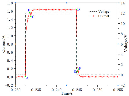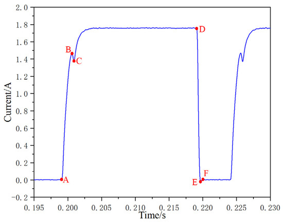The wet current dynamic characteristic test method is to dynamically monitor the current when there is oil flow in the system. During the test, the control signal is continuously input to monitor the current dynamic response characteristics. When the inlet pressure is 14 MPa, the control signal is 40 Hz, the duty cycle is 80%, and the current response is detected. The test results are shown in Figure 12, which shows the dynamic response curve of the current. Similar to the traditional method of characterizing the displacement of the valve core by the current inflection point, the AB section on the current curve represents the delay time period of the opening of the valve core, the BC section represents the delay time period of the opening movement of the valve core, the DE section represents the delay time period of the closing movement of the valve core, and the EF section represents the delay time period of the closing movement of the valve core. Under the current detection method, the delay time of valve core opening current is 1.22 ms, the rise time of valve core opening current is 0.42 ms, the total time of valve core opening is 1.64 ms, the delay time of valve core closing current is 0.25 ms, the decline time of valve core closing current is 0.36 ms, and the total time of valve core closing is 0.61 ms.