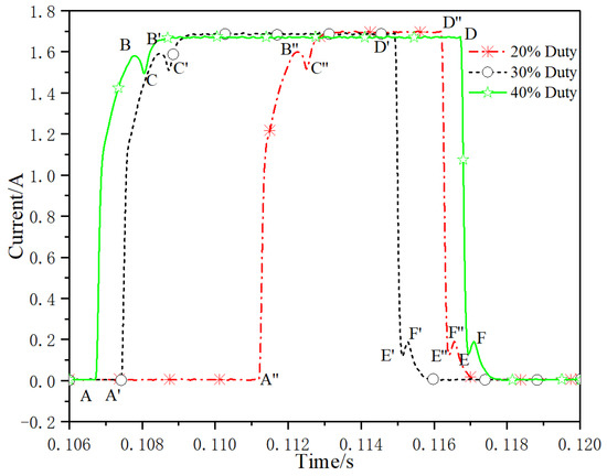 The dry current dynamic response characteristic test method used in this paper is to test the system without oil flow. This method can avoid the interference of various factors such as oil pressure and hydrodynamic force. Due to the different dynamic characteristics obtained by different pulse width duty cycle, if the duty cycle is too small, the valve core does not acquire enough electromagnetic energy, cannot overcome the external resistance such as friction and spring preload, the valve core has no action response, and the dynamic current cannot appear the inflection point when the valve core reaches the end. If the duty cycle is too large, during the closing process of the valve core, due to the excessive electromagnetic energy, the combined force of spring restoring force and friction force is difficult to overcome the electromagnetic force, so that the valve core cannot return to the initial position, and the inflection point of the dynamic current when the valve core reaches the initial position cannot appear. Therefore, in order to enable the valve core to be fully opened and fully closed, the paper selects the test condition of 50% duty cycle. The test curve of dry current dynamic characteristics is shown in Figure 10. Section AB on the current curve represents the delay time period of valve core opening, with a duration of 1.41 ms, section BC represents the delay time period of valve core opening movement, with a duration of 0.24 ms, and section DE represents the delay time period of valve core closing, with a duration of 0.31 ms. The section EF represents the delay time period of valve core closing movement, with a duration of 0.33 ms. The total opening time of valve core is 1.65 ms and the closing time of valve core is 0.64 ms. Study the influence of different duty cycle signals on dynamic characteristics. Select 40 Hz signal frequency, 20%, 30% and 40% duty cycle. The test curves of dry current dynamic characteristics are shown in Figure 11. Section AB (A′B′, A″B″) on the current curve represents the delay time period of valve core opening, section BC (B′C′, B″C″) represents the delay time period of valve core opening movement, and section DE (D′E′, D″E″) represents the delay time period of valve core closing, section EF (E′F′, E″F″) represents the delay time period of valve core closing movement. The duration of each period is shown in Table 3. It can be seen that the influence of control signals with the same frequency and different duty cycle on each dynamic response is almost negligible.
