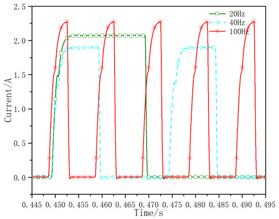 Under the test condition of inlet pressure of 14 MPa, adjust different working frequencies to study the influence of different frequencies on current response. In the test, the working frequencies are 20 Hz, 40 Hz and 100 Hz, and the duty cycle is 40%. The current response test results are shown in Figure 13. Under the current test method, the total opening time of valve core at different frequencies is about 1.64ms, and the total closing time of valve core is about 1.08 ms. The control signals of different frequencies have little effect on the current response time of opening and closing.
