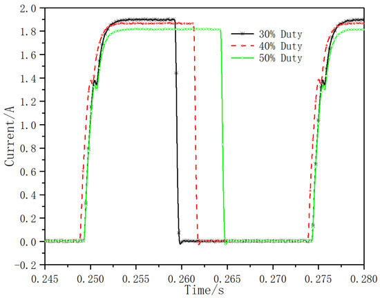 Under the test condition that the inlet pressure is 14 MPa, adjust the different duty cycle of the control signal, and study the influence of different duty cycle on the current response. In the test, the working frequency is 40 Hz, and the duty cycle is adjusted to 30%, 40% and 50%, respectively. The current response test results are shown in Figure 14. Under the current test method, the total opening time of the valve core at different frequencies is about 1.84 ms, and the total closing time of the valve core is about 0.69 ms. The control signals with different duty cycle have little effect on the current response time of valve opening and closing.