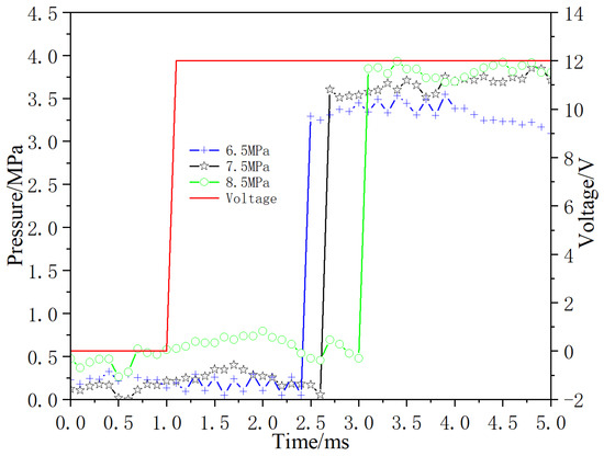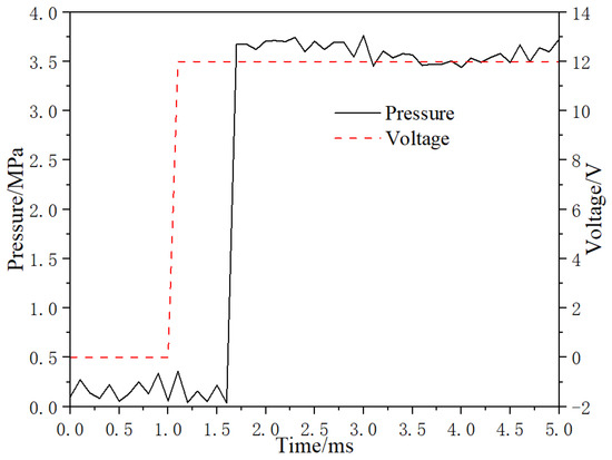In the pressure dynamic performance test, the control signal frequency of the micro high-speed digital valve is 50 Hz, the system pressure is adjusted to 10 MPa, when the duty cycle signal is 0, the valve is closed, and when the duty cycle is 100%, the valve is opened. Figure 16 is the corresponding curve of working voltage and digital valve outlet pressure when the valve port is opened. In the process of valve changing from closed state to open state, the working voltage jumps from 0 V to 12 V at 1 ms, the pressure response delay is about 0.7 ms, the pressure rise time is about 0.1 ms, and the whole pressure rise time is 0.8 ms.