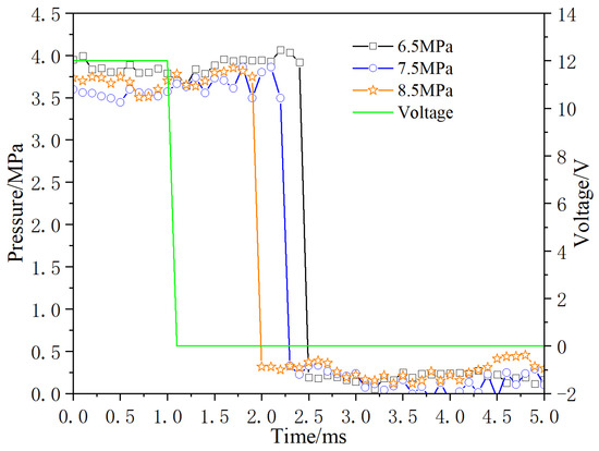 Adjust the inlet pressure of the digital valve to 6.5 MPa, 7.5 MPa and 8.5 MPa, respectively, and test the dynamic response of the opening and closing pressure. The test results are shown in Figure 17 and Figure 18, respectively. Under the condition of valve opening, with the increase of inlet pressure, pressure differential increases, and the pressure rise time increases; When the valve is closed, pressure differential increases and pressure drop time decreases with increasement of inlet pressure.