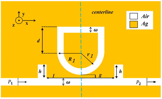 A schematic diagram of the designed structure is shown in Figure 1. A U-shaped cavity was chosen because it combines the advantages of circular and rectangular resonators. The rectangular resonator can change the vertical distance independently of the horizontal direction, and the straight waveguide is very beneficial to the transmission of light, but the coupling of the straight waveguide and MIM waveguide will cause a larger FWHM, and the perception performance will decrease. A circular resonator is the best choice, and displays a good performance in coupling with MIM waveguide. However, if the radius is increased, the increased cavity area in the vertical direction will lead to a decline in the sensor’s performance and an increased loss, thus affecting the spread performance. In the end, we chose the USRR structure. The coupling mode between the resonator and bus waveguide can be divided into side coupling and shoulder coupling. The structure proposed in this work adopts the side coupling mode. The geometric parameters of the structure settings are as follows: and are the outer radius and inner radius of the USRR taken separately; the height of the USRR is described as d; g is the coupling gap between the USRR resonant cavity and the bus waveguide; the distance between the two rectangular baffles and the height of them are denoted as l and h. The input and output ports are and , respectively, and represents the width of the MIM waveguide. is usually set to 50 nm to ensure only T mode exists in the waveguide [].