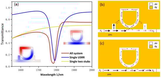 The blue line is a continuous curve with a narrow spectral width and low transmittance, and its transmission spectrum is similar to the shape of a Lorentz curve, showing a certain symmetry. Therefore, the transmission spectrum of single USRR can be considered as a discrete narrowband mode. As shown in Figure 2c, the SPPs indirectly motivated by the TM beam enter the bus waveguide from and most of them are trapped in the USRR resonant cavity. A few SPPs can return to the MIM waveguide and are propagated to to attain indirect excitation of the TM wave. The field distribution indicates that the USSR structure has a certain field intensity distributed in the whole bus waveguide.