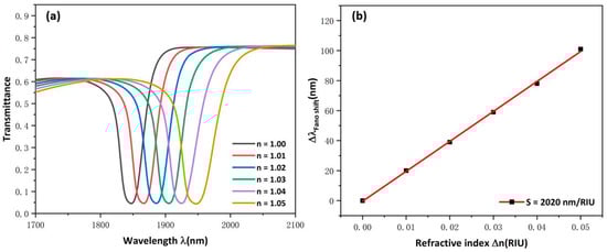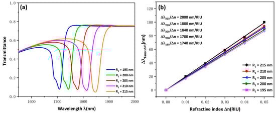 Based on the above analysis of the causes of Fano resonance, we know that the linear shape of Fano resonance can be changed by varying the broadband mode and narrow band mode, thus improving the performance of the sensor. By changing the parameters of USRR structure that generates narrowband mode, the influence of narrowband mode on the transmission performance of the whole structure was evaluated. The influence of USRR was further studied by setting to 215, 210, 205, 200 and 195 nm. In Figure 3a, as increases, the curves appear to undergo an obvious red shift with the transmittance decreased slightly. The reason for this is that due to the increase in the effective length of the USRR structure, the ability of the USRR to gather electric field increases, and eventually the resonant wavelength moves to a larger wavelength. Figure 3b shows the sensitivity fitting curve with a good linear relationship. Importantly, the change in sensitivity increases obviously from 1740 to 2000 nm/RIU as varies at 5 nm intervals. This indicates that is an important parameter to improve the sensitivity of the sensor. In practical application, proper parameters can be chosen according to the requirements of sensor manufacturing.