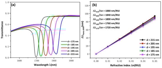 Subsequently, the influence of the changed d of USRR on the whole structure’s transmission characteristics was evaluated, which were found to have increased from 175 to 215 nm. As Figure 4a shows, the transmission spectra showed an obvious redshift with d increased. The reason for this is also due to the increase in the effective length of the resonator. That the transmittance increases slightly indicates that the ability of USRR structure to gather electric field decreases slightly with the increase in cavity height. As Figure 4b shows, the sensitivity fitting curve has a good linear relationship and the sensitivity changes from 1720 to 1880. This indicates that the height of USRR structure has less influence on sensitivity than the radius; thus, changing d can improve sensitivity in a certain range.