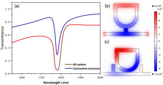 (a) Transmission spectra of two structures; (b) field distributions of the contrastive structure; (c) field distributions of the system.
