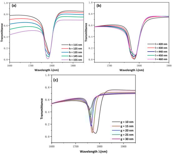 The influence of MIM waveguide structural parameters on system characteristics were further researched; we changed the height of rectangular baffle h from 115 to 155 nm and increased the distance between the two rectangular baffles l from 420 to 460 nm with an increase of 10 nm. As shown in Figure 6a,b, the dip position remains constant no matter how h and l were changed, which indicates that the wavelength is basically unchanged and the two parameters are not sensitive to the refractive index sensor. However, it can be seen from Figure 6a that changing h will change the shape of the curves more obviously, which transformed an almost symmetrical shape into an entirely asymmetrical shape. When h increases, the transmittance will gradually decrease, which shows that as the rectangular baffles get closer to USRR, more electric fields can be accumulated on the USRR, which ensures the good performance of the sensor. The same phenomenon is also shown in Figure 6b. When l decreased, the transmittance will gradually increase, which shows that USRR has a relatively strong resonance. Thus, the closer the rectangular baffles are to the resonator, the stronger the intensity of the field that will be gathered in the resonator and the performance of the device will be improved. The h is a more vital parameter than the distance between the two rectangular baffles in affecting the shape of the continuous broadband state. The above research indicates that transforming the h parameter can change the line’s shape without affecting its dip wavelength.
