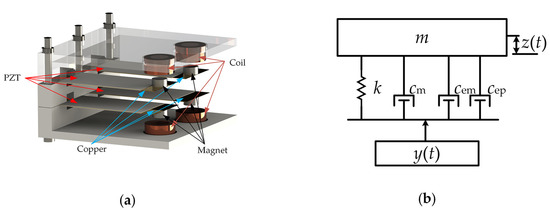 We modeled the hybrid energy harvester as a mass-spring-damper system as shown in Figure 1b. As can be seen from the figure, cm, cem and cep are the mechanical, piezoelectric and electromagnetic damper constants, respectively. The vibrating structure is represented by a spring with stiffness, k, and mass, m. is the source vibration function (where Y and are the source vibration amplitude and frequency), and z(t) is the relative deflection due to the source vibration. The governing equation of the relative displacement, z(t), caused by harmonic base excitation, y(t), is as follows: