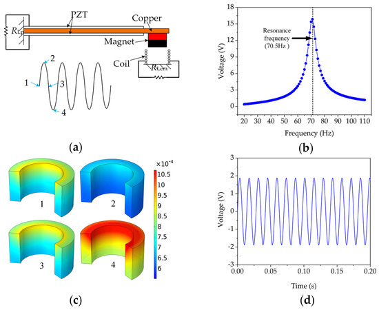 Simulation demonstration and result of a typical HEH: (a) schematic diagram and motion curve of a typical HEH; (b) open-circuit voltage of the PEG portion according to the input vibration frequency; (c) magnetic flux density (unit: T) in the coil at point 1, 2, 3 and 4; (d) open-circuit voltage of the EMG portion at 70.5 Hz.