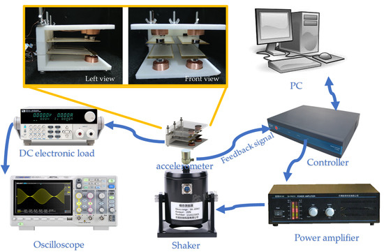 The piezoelectric–electromagnetic HEH array fabricated in this work is shown in Figure 3 as well as the experimental setup. The main instruments used in the study were a mechanical shaker (SHIAO SA-JZ002, Wuxi, China), an accelerometer (SHIAO SAPC0004, Wuxi, China), a power amplifier (SHIAO SA-PA010, Wuxi, China), a controller (ECON VT-9002, Suzhou, China) and an oscilloscope (SIGLENT SDS1104X-C, Shenzhen, China). The shell was fabricated by 3D printing, and the device’s dimensions were 90 × 90 × 55 mm. The piezoelectric sheet consisted of three layers: the top and bottom layers were piezoelectric ceramic material (PZT) of the dimensions 70 × 30 × 0.2 mm; the middle layer was made of beryllium copper with a size of 80 × 33 × 0.2 mm. One end of the piezoelectric sheet was fixed onto the shell to form a cantilever beam with long screws. When externally excited, the other end could vibrate freely. Four piezoelectric cantilever beams formed an array structure, the spacing between the upper and lower cantilever beams was 10 mm in the first place, and the distance between the left and right cantilever beams was 15 mm. A permanent magnet with a magnetization intensity of approximately 1.0 T was fixed on the other end of the copper, and it was distributed concentrically with a coil with a wire diameter of 0.2 mm and a number of 1080 turns. The permanent magnets in the vertical direction were repulsive. We connected the piezoelectric sheets in parallel and the coils in series to obtain a higher output current and voltage.