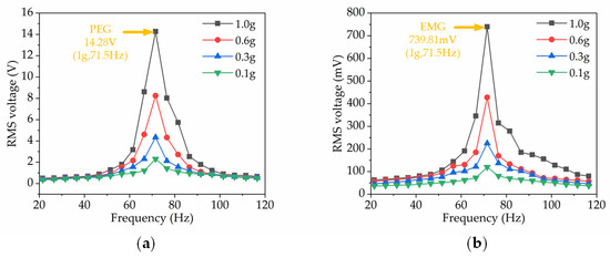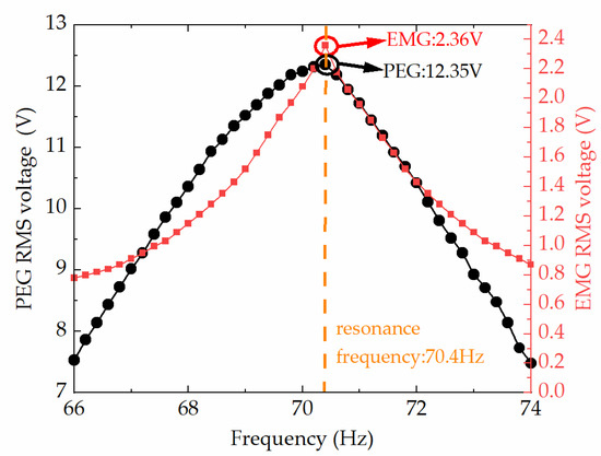 For the array HEH, the test of frequency sweep was repeated several times to confirm the resonant frequency. The frequency sweep range was 66–74 Hz, while the acceleration was set constant at 1 g. It should be noted that the piezoelectric sheets were connected in parallel and the coils were in series for a higher PEG current and EMG voltage. As shown in Figure 6, the maximum RMS open-circuit voltage of the PEG and EMG was obtained at a resonant frequency of 70.4 Hz. The maximum RMS voltages were 12.35 V for PEG and 2.36 V for EMG, respectively.