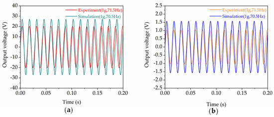 Comparison of a time-domain diagram of the experimental and simulation results of the output voltage of one HEH module: (a) PEG; (b) EMG.