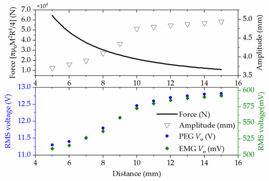where μ0 represents the vacuum permeability; M indicates the magnetization of the magnets; x denotes the vertical distance between magnets, which was herein seen as a key geometry factor for this HEH array. Figure 7 plots the force, F(x), between two magnets according to the distance, x. The vertical distance between magnets was set in the range of 5–15 mm. With the increase in the distance, the vibration amplitude was less affected. The figure also shows that the vertical distance had an effect on the RMS value of the open-circuit voltage. In addition, the increasing trend in the output voltage of the HEH array with a distance over 10 mm was not as obvious as when it was less than 10 mm. Thus, a column height of 8–12 mm was chosen for designing the array HEH.