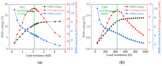 The output voltage, current and power across varied load resistances: (a) PEG; (b) EMG.