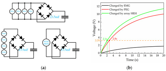The experimental circuit and results of charging: (a) the circuit of the charging capacitors; (b) voltage curve showing a 23.5 mF capacitor charged by PEG, EMG, and array HEH.