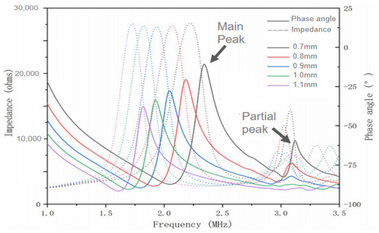 The most effective vibration mode of the ultrasonic transducer is the longitudinal vibration mode of the piezoelectric arrays, and too much transverse vibration between the arrays will weaken the longitudinal waves entering the medium. It is necessary to optimize the size of the piezoelectric material (PZT-8 thickness 0.5 mm) to ensure that the piezoelectric array elements can be in longitudinal vibration mode in the design. PZFlex finite element simulation software simulates and designs the piezoelectric array element without setting the backing and matching layer. Figure 1 shows the simulation results of electrical impedance and phase angle of piezoelectric array elements in different sizes. Piezoelectric array elements with different side lengths show an obvious main peak of resonance frequency, and the resonance frequency will shift to low frequency with the increase of piezoelectric array element side length. It should be noted that when the side length of the piezoelectric array element is greater than 1 mm, the main peak of resonance frequency is relatively obvious, and there is no secondary peak interference of other obvious vibration modes. The working mode of the piezoelectric array is relatively single. When the side length of a piezoelectric array element is less than 0.9 mm, the secondary peak of resonance frequency is particularly obvious, and the main peak of resonance frequency will be affected by the secondary peak, indicating that the longitudinal vibration of the piezoelectric array element will be disturbed by other vibration modes, and the emission efficiency will be reduced. Therefore, the minimum side length of 0.9 mm is selected as the final size of the piezoelectric array element.