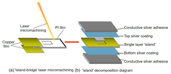 Single-layer “island bridge” structure based on laser micromachining was used to design 2D-FUA. The array elements are arranged in a matrix of 8 × 8 array electrodes, and the circuit and flexible interconnection are realized between each unit in a single-layer “island bridge” structure. As shown in Figure 3a, polyimide film (PI film 0.2 mm) is wrapped and pretreated by conductive copper film. A single-layer “island bridge” is processed directly on the surface of PI film by laser. The square groove provides a solid and reliable framework for rigid PZT (PZT-8). The single-layer “island bridge” has simple structure and is easy to manufacture. Compared with the “island-bridge” structure proposed by Xu et al., the single-layer “island-bridge” structure can exhibit higher flexibility to adapt to complex surfaces [27,28]. Figure 3b shows the structure and function of a single-layer “island” in the 2D-FUA. The silver coating wraps the top and bottom of the PI film. The silver paste coating on both sides of the array element provides excellent electrical interconnection, effectively suppresses the ringing effect (excessive vibration), and improves the axial resolution of the pattern. An improved superior serpentine hinge is applied to realize array “island” and circuit interconnection [29]. The optimized superior serpentine hinge is composed of a basic half hinge and an antisymmetric half hinge, and the right angle connection is used at both ends of the hinge to replace the corner connection, which can better resist the repeated shear stress at the hinge connection in tension. The thickness of the entire flexible hinge matrix is designed to be 0.25 mm, the width of the serpentine hinge is 0.2 mm, the center distance between the serpentine hinges is 0.4 mm, and the spacing of the array elements is 3.4 mm.