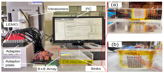 As shown in Figure 8, the 2D-FUA curved surface imaging platform is built based on the Verasonics system. The 2D-FUA is affixed along the curved surface of the inner wall of the water tank, and the array performs B-type ultrasound scanning based on the array element spatial coordinates on the randomly placed steel column target to obtain the location of the target object by imaging. As shown in Figure 8b, the curved glass tank was filled with deionized water (acoustic impedance of water is about 1.5 MRayl, acoustic impedance of biological soft tissue is about 1.6 MRayl), and the electrode wire of the 2D-FUA was connected to the adapter of the ultrasound platform panel interface through an adapter plate. The glassware was 100 mm in diameter and the wire was 1 mm in diameter without matching and backing layers. Since the scanning area of the 2D-FUA is a spatial cube, a B-scan of the surface array can yield any 2D cross section. The dimension of the cross section in the x-direction is defined as the width of the array without bending, and the depth in the z-direction is defined as 12. All the array elements transmit ultrasonic waves simultaneously and reconstruct the received signals on the two-dimensional cross section at once. In addition to this, planar experiments of 2D-FUA were also provided to further validate the flexible array imaging performance in Figure 8a.