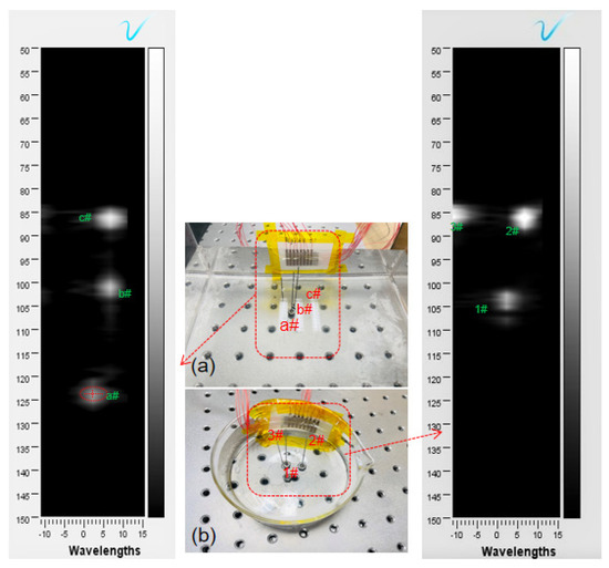 Figure 9a shows the results of the 2D-FUA planar scan imaging with three randomly placed steel pins in the sink at the theoretical distances of 52 mm, 55 mm, and 70 mm from the array plane. The bright spots represent the three randomly placed steel pin positions, and the bright spots occupy the vertical axis coordinate values representing the measured wavelength distance between the steel pins and the array plane. Three different bright spot locations were captured, and the wavelength–distance position relationship was calculated to obtain 52.8 mm for the ellipse center of point a#, 56.8 mm for point b#, and 72.9 mm for point c#. The results show that the target distance measurements are very close to the theoretical values, with accuracy errors of 1.54%, 3.27%, and 4.14%, respectively.
