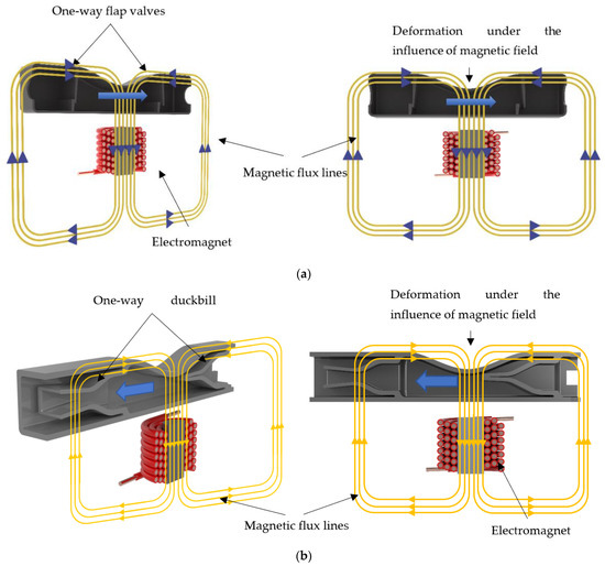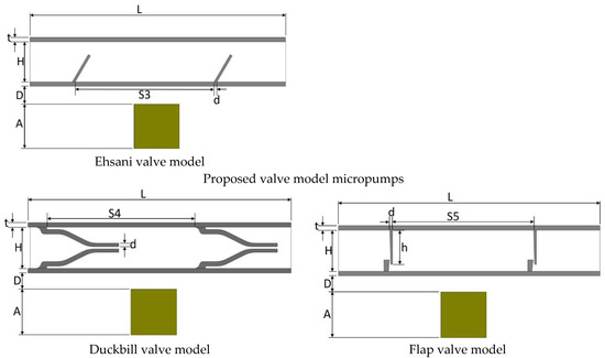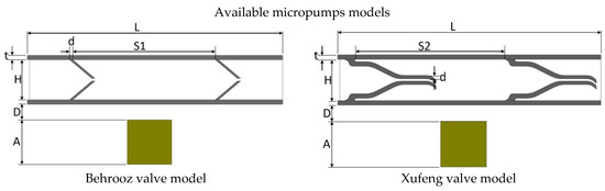 Micropump models with their main components: (a) flap valve model; and (b) duckbill valve model.