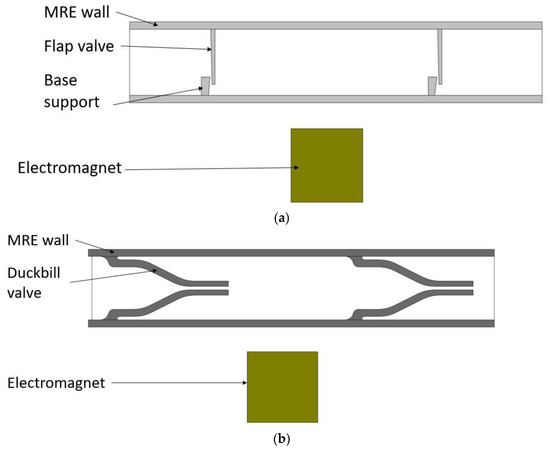 Among the proposed designs, the flap valve model consists of a pump chamber, two one-way flap valves and an electromagnet, while the duckbill valve model is composed of a pump chamber, two one-way duckbill valves and an electromagnet (Figure 1). The top wall of the pump chamber is made of a semi-active smart material called magnetorheological elastomer (MRE), while the rest of the structure is made from a passive elastomer. MREs falling in the category of composite materials are composed of a rubber-like base matrix, such as silicone and micron-sized iron particles doped in it. Because of their ferromagnetic properties, the MREs deform or can be designed to resist the deformation in the presence of a magnetic field, depending on design intent. Since their mechanical properties alter by the induced magnetic field, they are properly categorized as semi-active materials. In the proposed micropump design, under an external magnetic field, the top wall contracts inwardly in the pumping chamber. The amount of contraction depends on the intensity of the applied magnetic field, which can be controlled via an external electromagnet. The deformation on the top wall creates a squeezing effect on the fluid inside the flow chamber, pushing the fluid through the one-way valve in the front end. While this is occurring, a one-way flap and duckbill valve in the rear end prevents the fluid from leaking backward, thus creating an effective unidirectional pumping mechanism.