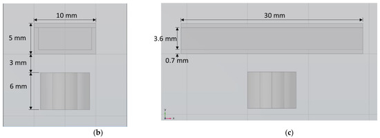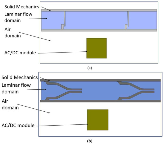 The proposed design involves coupled magneto-solid-fluid interaction physics. Thus, the performance of the pump could best be predicted with the help of computer simulations rather than simplified 1D analytical models. In this study, simulations were carried out using COMSOL Multiphysics software (v5.6, Burlington, MA, USA). Figure 2 shows a schematic of the model created in COMSOL.