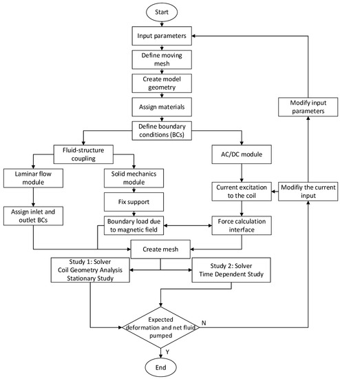 The simulation procedure is illustrated with the flowchart shown in Figure 5. First, the variables such as geometric and material properties were defined. Since the simulation involves the deformation of the pump chamber and one-way valves, the moving mesh schemes were defined next. Then the simulation geometry was created, which was followed by the material assignment to all solid and fluid domains. Next, the respective boundary conditions were assigned in each physics module, i.e., AC/DC module, solid mechanics module and laminar flow module. Then these different modules were communicated with each other to transfer data between different flow physics. For example, the upper wall of the pump chamber deforms under the influence of a magnetic field since it is a ferromagnetic material. To model this phenomenon, the AC/DC module was run to calculate the magnetic field over the entire domain, including all solid and fluid domains. Then this information was passed to the solid mechanics module to calculate the resultant deformation under the influence of the magnetic field. Similarly, the deformation data on the seal was transferred to the fluid domain via fluid-structure coupling between the solid mechanics and laminar flow modules. This reflected itself as a pressure load on the fluid domain at the fluid-solid interface, causing the fluid flow, and thus the pumping effect. While the fluid was pushed through the front valve, the pressure data on the valves were communicated, again, with the fluid-structure coupling. Note that the fluid-structure coupling was a two-way coupling, which provided convenience when the data was communicated back and forth between the solid and fluid domains. This was done by defining fluid-structure interaction Multiphysics at all interfaces between the fluid and solid domains.