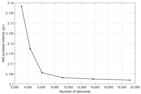 As is commonplace procedure for conducting simulations in both Finite Element Analysis (FEA) and Computational Fluid Dynamics (CFD), a mesh independency analysis was conducted. To begin this process, a course mesh was applied to an initial simulation. Then, the mesh size was reduced continually, and the net pumped volume was monitored after each run. The mesh size reduction continued until there was no significant change between two sequential cases. This process is shown in Table 3, which is also visually illustrated in Figure 6. From the recorded cases, it can be seen that the percent change in the target parameter was 0.14% between grid numbers 4 and 5. Thus, grid number 4 is selected for the rest of the simulations.