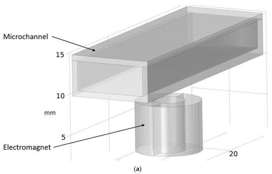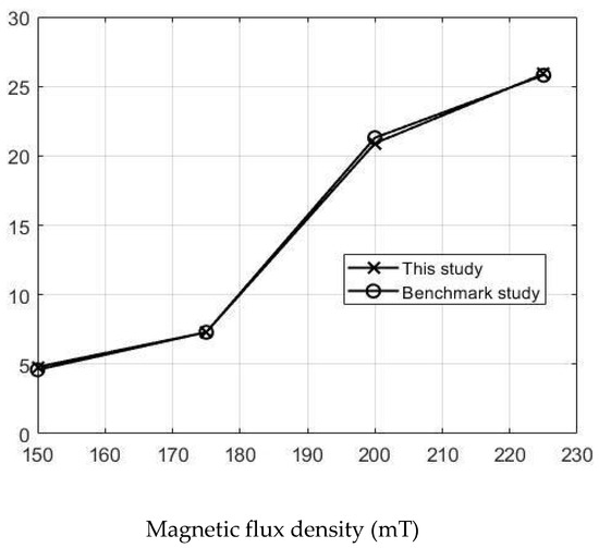 Although COMSOL Multiphysics is a proven simulation tool and has been employed by thousands of scientific studies in the literature, it is always wise and scientifically required to validate the simulation approaches with the existing studies in literature when experimental data is not readily available. To this end, we selected the model presented in [18]. All parameters, boundary conditions, magnetic flux density and geometric dimensions were set to be the same. Figure 7 shows the model with the main components, as well as the dimensions.